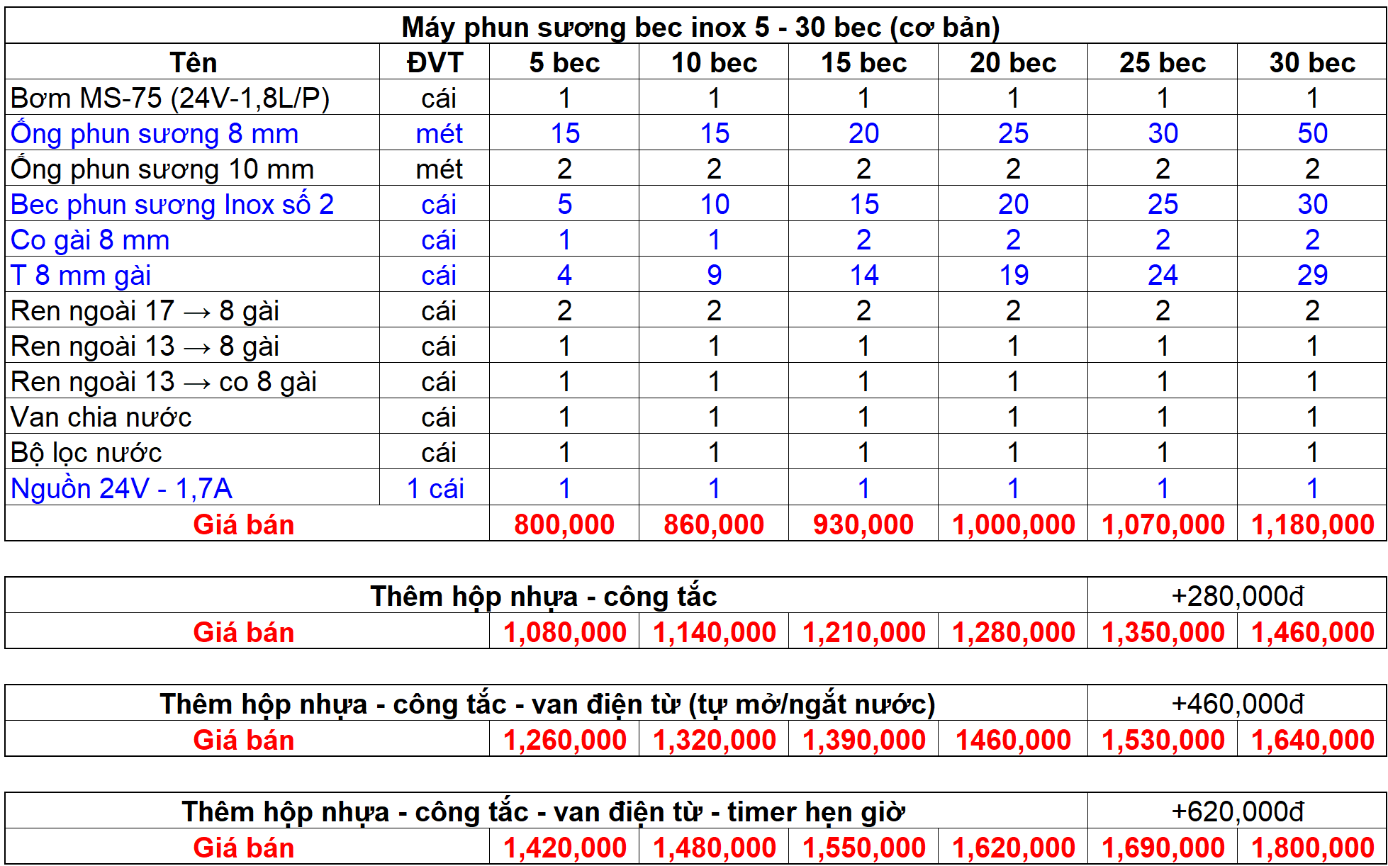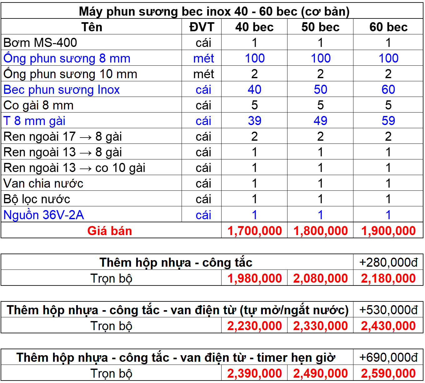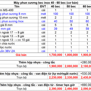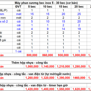 | Chọn số bec phun | 5 bec, 10 bec, 15 bec, 20 bec, 25 bec, 30 bec, 40 bec, 50 bec, 60 bec |